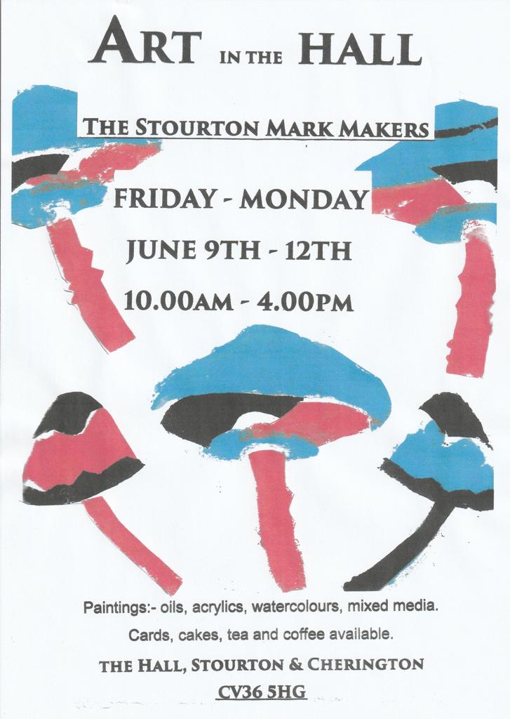 There will be an art exhibition by the Stourton Mark Makers in The Hall from Friday June 9th – 12th from 10.00 – 16.00.