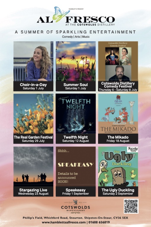 A dazzling new programme of outdoor comedy, music, theatre, opera, arts, crafts and family fun has been curated by Cotswolds-based producers, Hambletts and runs from July through September at The Cotswolds Distillery.