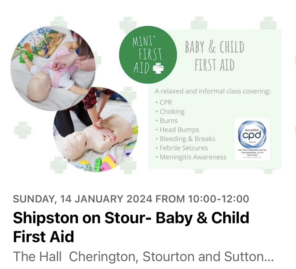 Mini First Aid Warwickshire, Coventry and Tamworth are running a Baby & Child First Aid training session covering newborn to 18 yrs, from 10am -12 noon, next Sunday 14th January at The Hall.