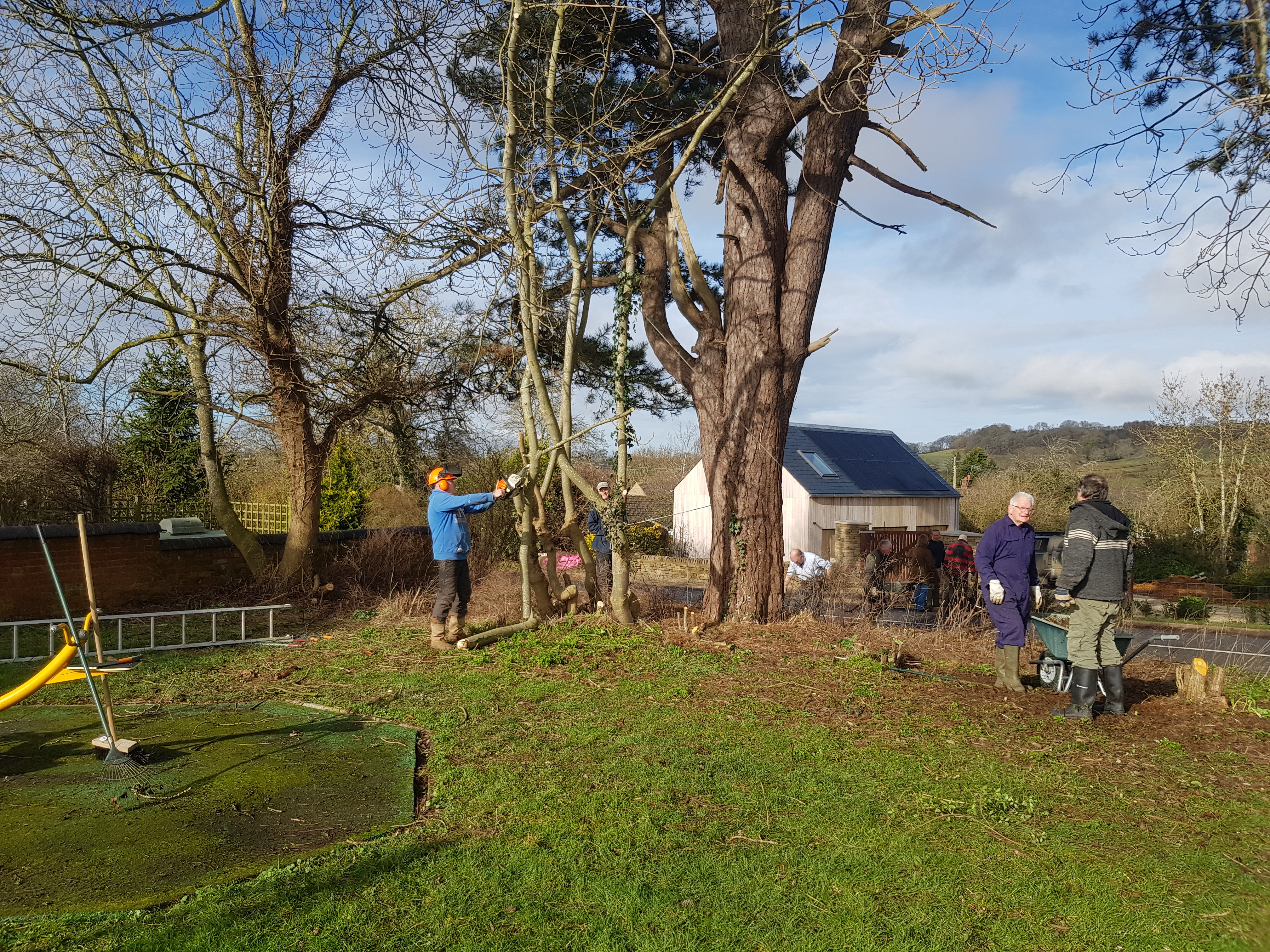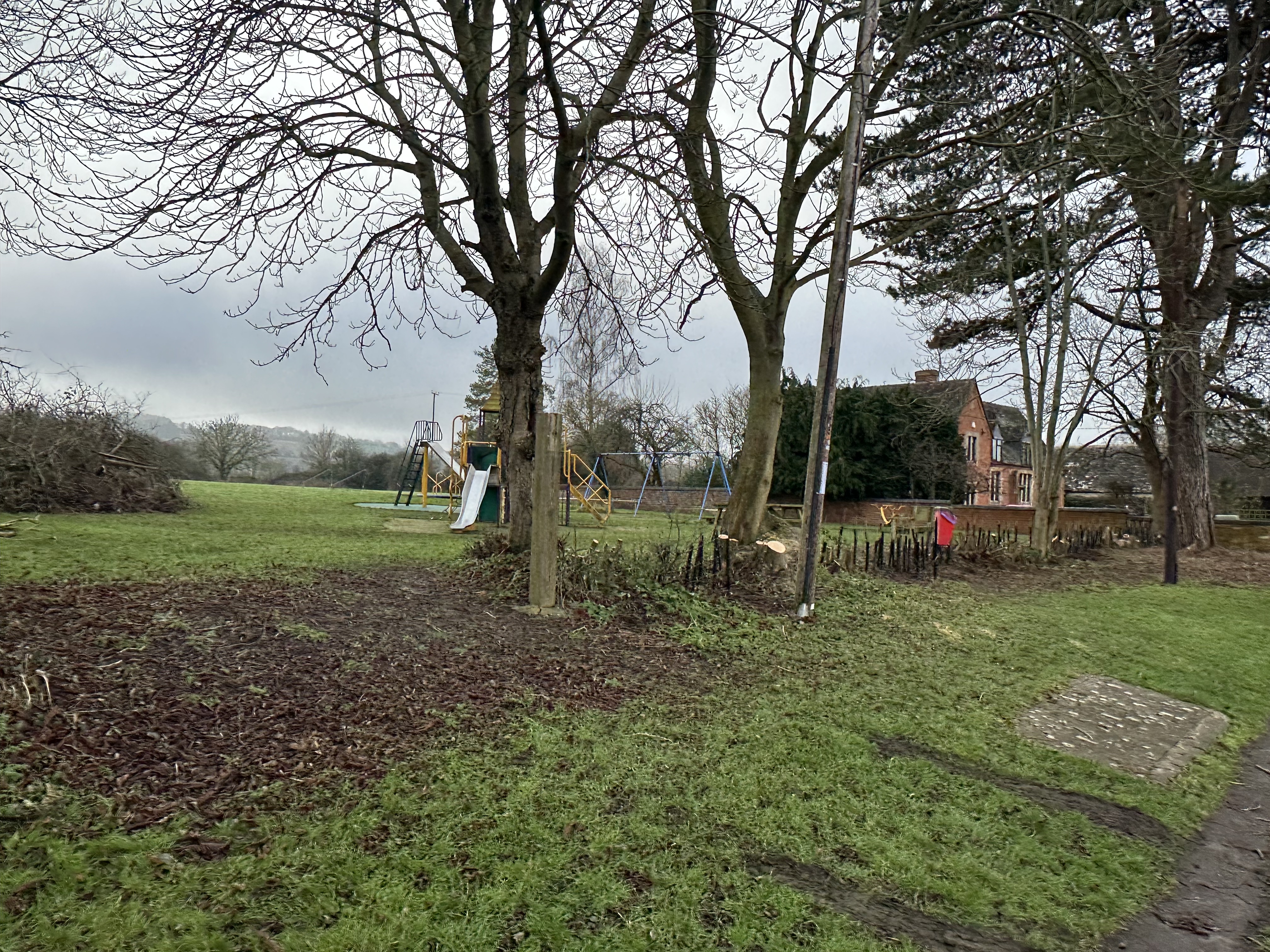‘The Aspirational Plan having recently been approved, a Working Group of some 20 volunteers met to start work on the first phase of the work on a sunny Saturday morning. Anyone passing the Playing Field recently will notice a big change with the roadside hedge having been coppiced and the gaps replanted.  Repairs have been made to the Playground equipment.  Thanks to all who participated, a great deal was achieved.  There is going to have to be a big bonfire when conditions allow.