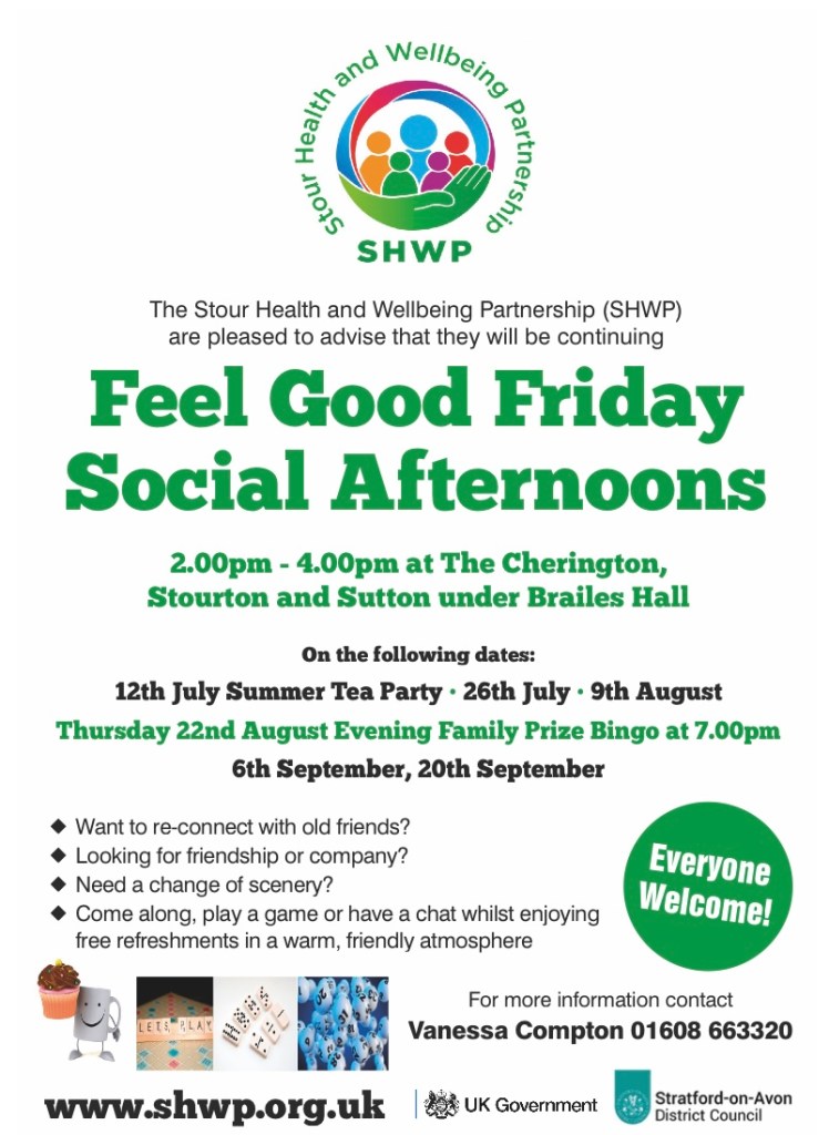 Feel Good Friday Social Afternoons are run by the Stour Health and Wellbeing Partnership (SHWP) every other Friday at The Hall. (See poster below).