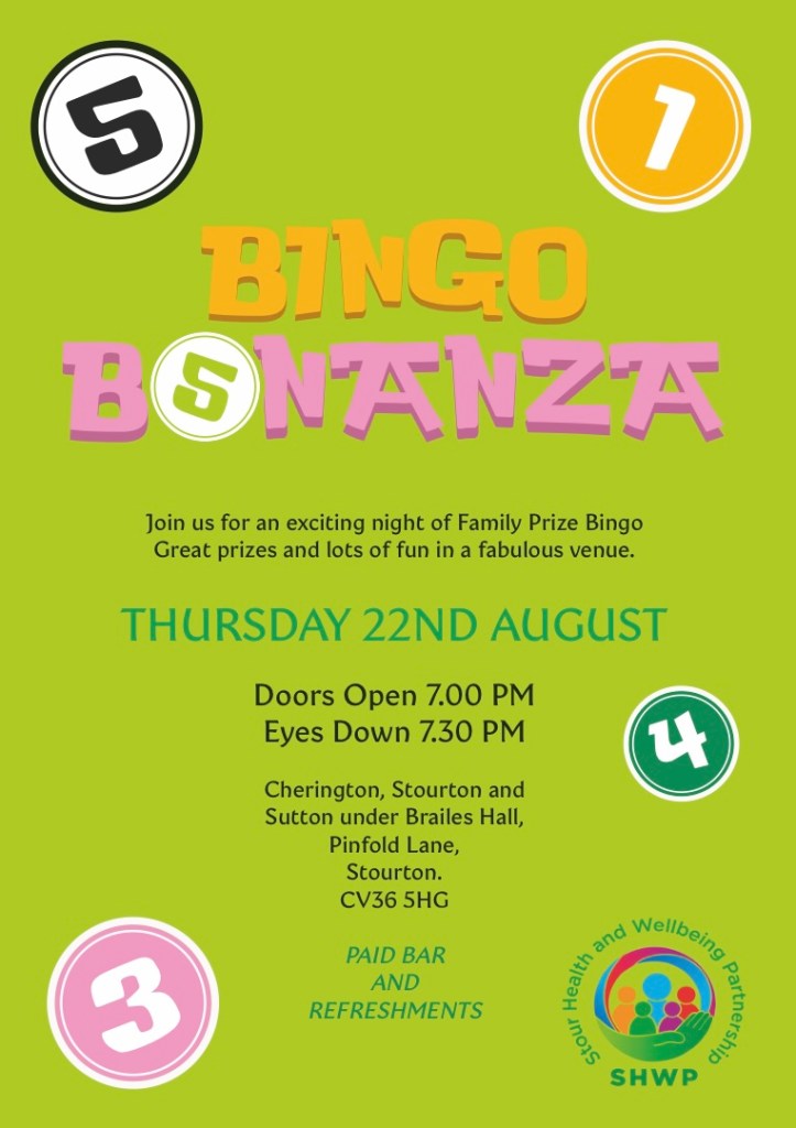 There will be a Family Prize Bingo evening on Thursday 22nd August at 7pm run by the Stour Health and Wellbeing Partnership (SHWP) at The Hall. This will be a fun evening for all!