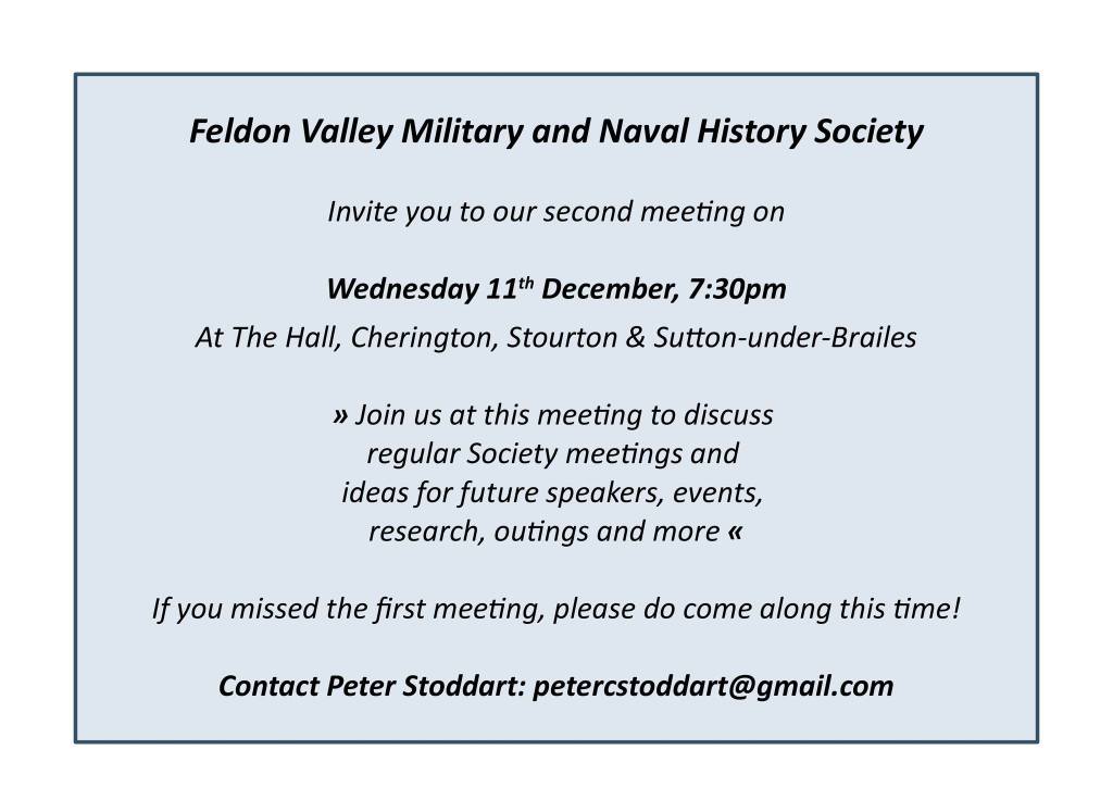 The Second Meeting of the Feldon Valley Military and Naval History Society is on Wednesday December 11th at The Hall at 7.30 pm
