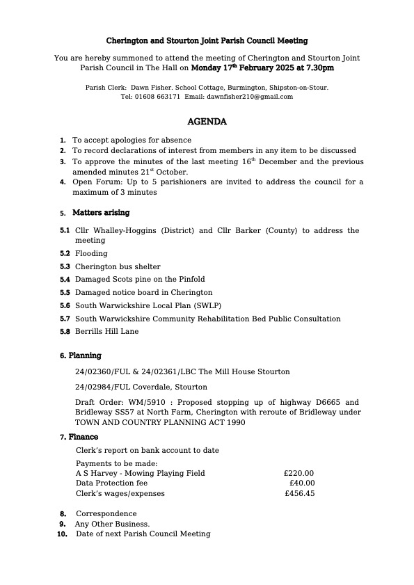 Cherington and Stourton Parish Council Meeting – Monday February 17th Leave a reply The next meeting of the Cherington and Stourton Parish Council Meeting will be held at The Hall on Monday February 17th at 7.30 pm. For agenda see below. For previous minutes and agendas – click here Share this: Click to share on Facebook (Opens in new window) Facebook Click to share on X (Opens in new window) X Click to email a link to a friend (Opens in new window) Email Click to share on WhatsApp (Opens in new window) WhatsApp Click to share on Nextdoor (Opens in new window) Nextdoor Like Loading... Related