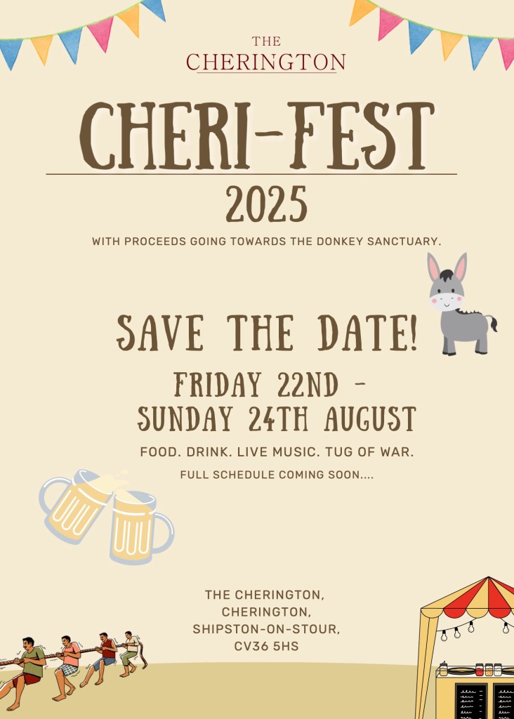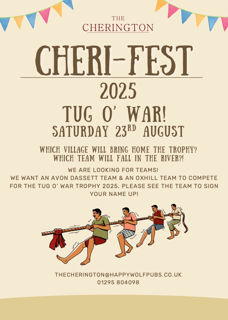 - Cheri-Fest 2025 – Friday 22nd – Sunday 24th August – save the date! Food, drink live entertainment and very special Tug of War Competition on 23rd! (More details coming soon).