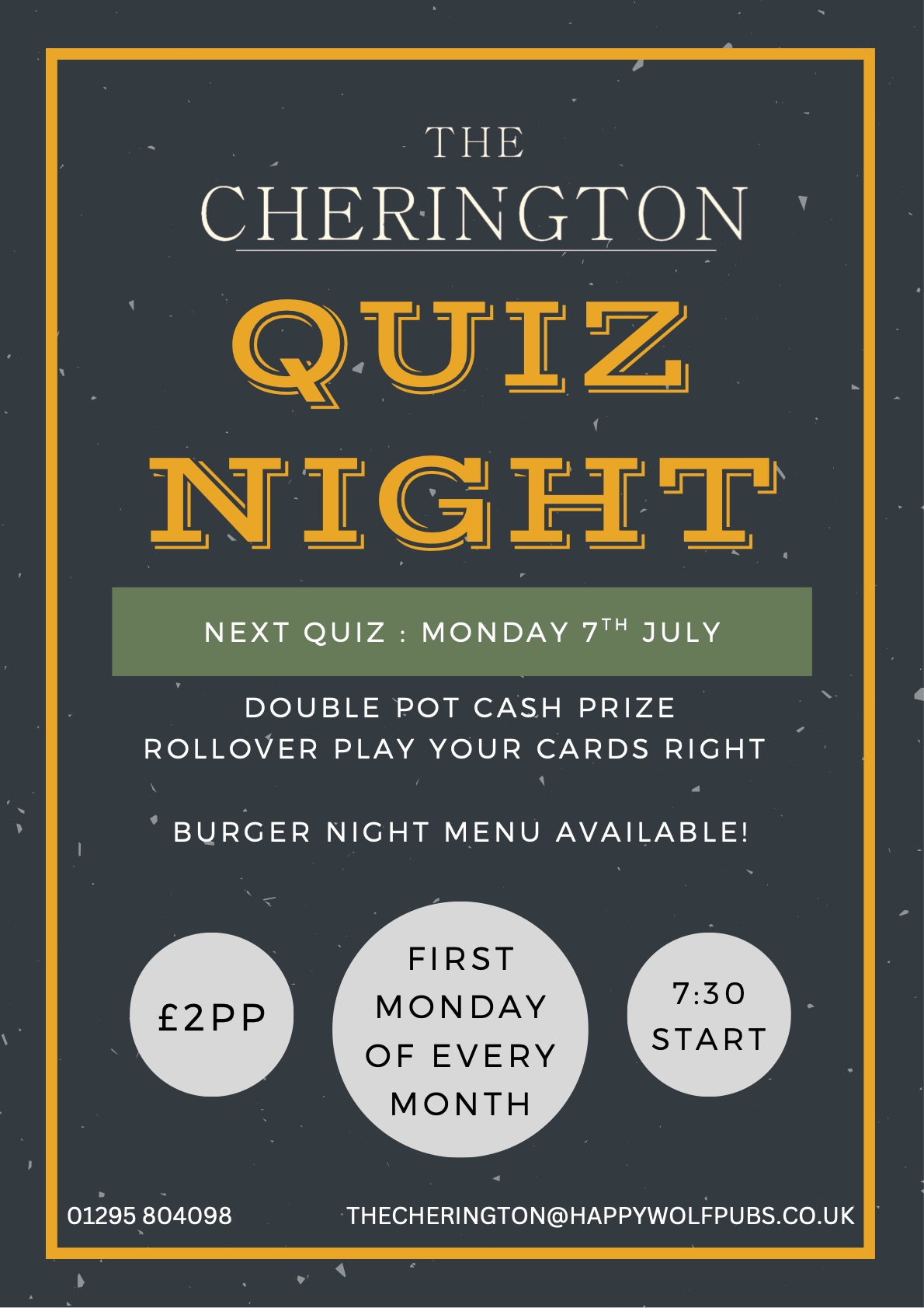 - Quiz Night (in conjunction with Burger Night) – every first Monday of the month – next one on July 7th