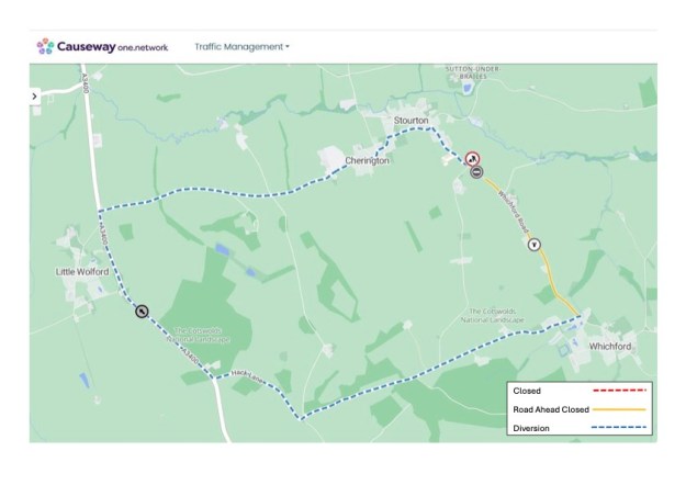 Whichford Road, Stourton closed to vehicular traffic between the junctions of Marsh Farm Lane and Long Compton Road for drainage works 30th July – August 1st