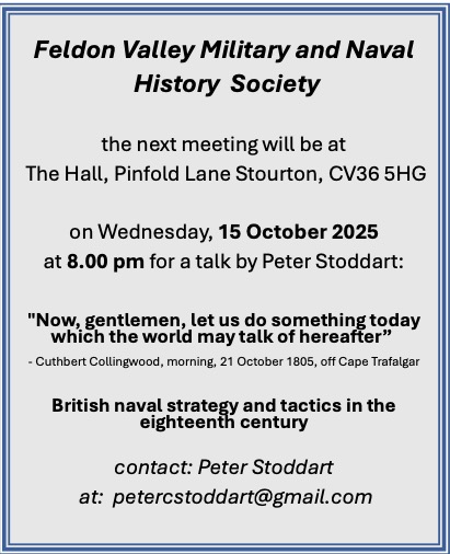 The Next Meeting of the Feldon Valley Military and Naval History Society is on Wednesday October 15th at The Hall at 20.00