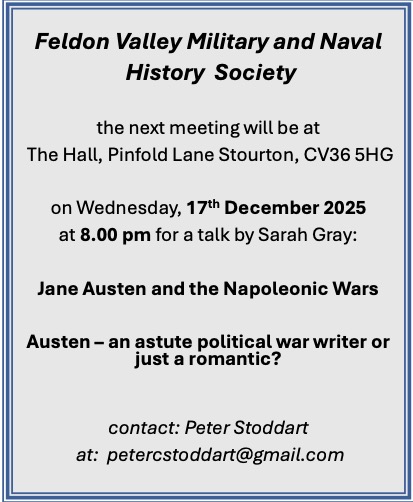 Jane Austen makes an appearance during her 250th birthday celebration year at the next meeting of the Feldon Valley Military and Naval History Society on Wednesday December 17th at The Hall at 20.00