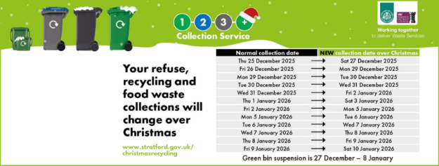 For more details and a link to the December Stratford District Newsletter see Refuse and recycling Collections for Christmas and New Year