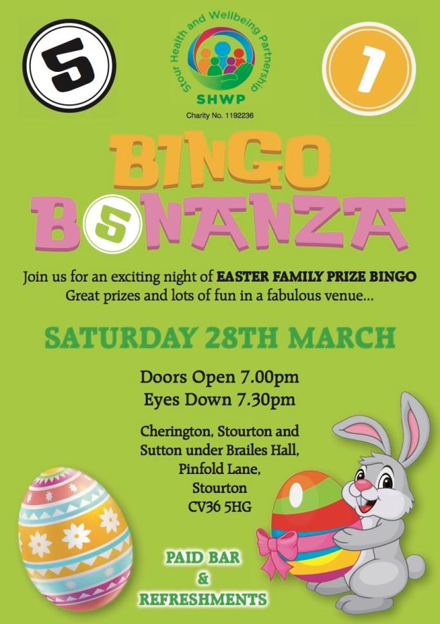 This Saturday evening, 28th Marchl, come and join the fun at the Easter Family Prize Bingo at The Hall organised by Stour Health and Wellbeing Partnership – SHWP