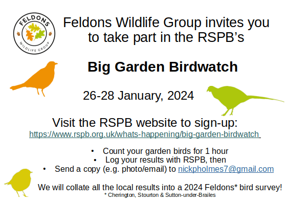 ‘Feldons Wildlife Group invites you to take part in the RSPB’s Big Garden Birdwatch, 26-28 January, 2024.