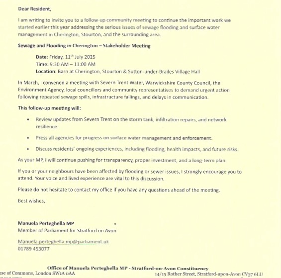 The third public meeting on this topic was convened by our local MP, Manuela Perteghella, to call Severn Trent Water to account for failure to resolve sewage and flooding problems in Cherington and Stourton.